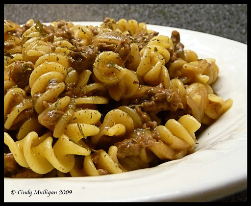 Once the beef mixture is cooked, and the pasta and been cooked and drained, add the pasta to the beef and mix well. Pour the sauce over the pasta and beef mixture. Mix well. Salt and pepper to taste, if you feel it needs more seasoning.