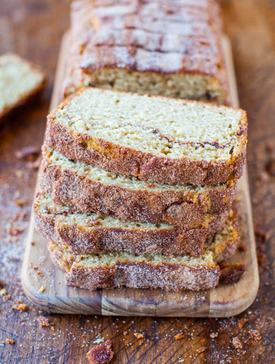 8.Invert bread over the sink or a paper towel to catch some of the non-adhered cinnamon-sugar and sprinkle it back on the bread. Place bread on wire rack to cool completely. Bread will keep airtight at room temperature for up to 5 days, or may be frozen for up to 3 months. Makes wonderful toast.