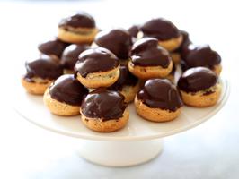Melt the remaining ganache gently over a double boiler, just until it is soft enough to dip the cream puffs and get a shiny glaze. Remove from heat and repeat with the rest of the cream puffs. Set the dipped puffs back on the cookie sheet and place them in the refrigerator until the ganache on top is set. Serve with tea, coffee or a tall glass of milk.