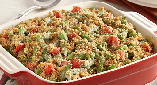 The traditional green bean casserole is made even better. We’ve updated it by adding vibrant red grape tomatoes, a creamy Parmesan cheese sauce, and a crisp bread crumb topping.