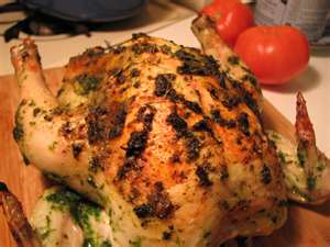 Check the chickens about 15 minutes into the cooking process, the skin should be starting to turn a lovely brown. Lower the heat to 375 degrees F and continue roasting. After another 15 minutes, remove the chickens from the oven and turn over. At this point check the level of liquid in the roasting pan. If most of the liquid has evaporated, add another cup of stock and return the chickens to the oven. When the chickens have browned on the bottom, about 15 minutes, remove them from the oven and turn them back over. Return the chickens to the oven for the final 15 minutes of cooking. During this time the skin on the chickens should be very brown and crispy. Remove the chickens from the oven and take the temperature in the crease between the thigh and the breast. (When doing this be sure not to have the thermometer probe touch a bone or you will get an inaccurate reading.) The thermometer should read between 160 and 170 degrees F. When cooking poultry in general the rule is 17 minutes per pound. If the thermometer reads less than 160 degrees F return the chicken to the oven for an additional 10 minutes and then re-check the temperature.