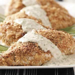 In a shallow bowl, combine the first six ingredients. Place milk in another shallow bowl. Dip chicken in milk, then roll in cornflake mixture.