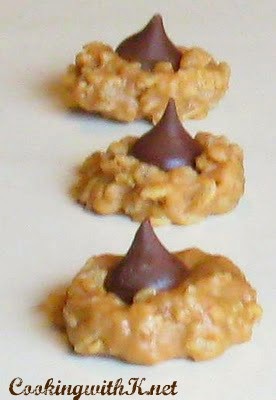 Quickly spoon mixture onto waxed paper and immediately press a Hershey's chocolate kiss in the center.