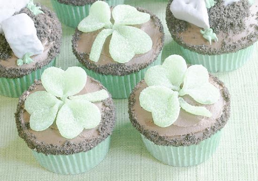 Spoon the chocolate cookie crumbs into a small shallow bowl. Spread the tops of the cupcakes with the chocolate frosting and smooth. Roll the edges of the cupcakes in the cookie crumbs. Arrange 3 to 4 green candy leaves on top of 12 of the cupcakes, pointed end in center. Add a green stem. Transfer 2 of the chilled gray dipped breakfast treats on top of each of the remaining cupcakes. Sprinkle with additional cookie crumbs. Snip a small (1/8") corner from the bag with the green frosting. Pipe pulled dots to make patches of grass in random areas next to the blarney stones.
