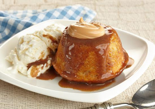 To serve place one cake on a plate, top with a dollop of the caramel frosting and serve with vanilla ice cream.