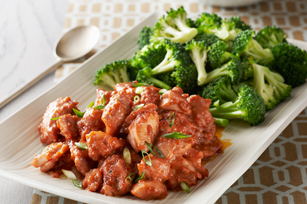 TRANSFER broccoli to serving plate; cover to keep warm. Heat remaining dressing in skillet on medium-high heat. Add garlic and ginger; cook and stir 1 min. Add chicken; cook 2 min., stirring frequently. Stir in peanut butter mixture; cook 5 to 7 min. or until chicken is done and sauce is thickened, stirring frequently to scrape up browned bits from bottom of skillet.