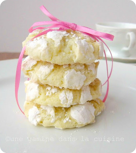 Remove the dough from the refrigerator. For each cookie, measure out a slightly rounded Tablespoon-size clump of dough. Roll each "clump" of dough through the confectioner's sugar until lightly coated, then roll each clump into a ball. Re-roll the ball in the confectioners' sugar until heavily coated. [Note: If the bowl of sugar is large enough, you can make about 6 cookies at a time.]