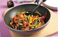 Preheat a non-stick wok or large frying pan. Drain the pork, reserving the marinade, and add to the pan. Stir-fry the pork until the meat starts to firm up. Add the peppers and spring onions along with the reserved marinade.