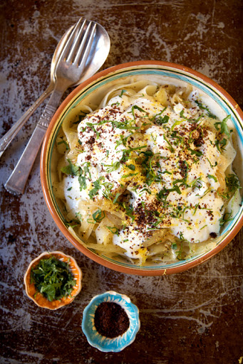 2. Bring a large pot of salted water to a boil; cook tagliatelle until al dente, about 7 minutes. Drain pasta and divide between 6 serving bowls. Top with garlic-onion mixture, yogurt, parsley, mint, sumac, salt, and pepper; drizzle with remaining oil.