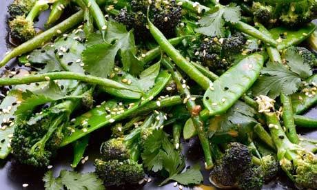 Yotam Ottolenghi: Japanese sweet sesame sauce, paired with a popular seasonal ingredient, purple-sprouting broccoli. Here it's combined with other greens for a refreshing blend of textures, but it works solo, too. Please forgive me the unorthodox mix of tahini and soy - my defence is it works perfectly.