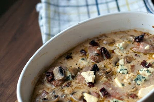 Blanda buljong. grädde, vetemjöl och den sista teskeden med soja i en kastrull. Låt koka upp och smaka av med salt och peppar. Häll såsen över köttet och ställ sedan in formen i ugnen i ca 20 minuter. Ta ut gratängen och strö över smulad gorgonzola. Servera med ris.