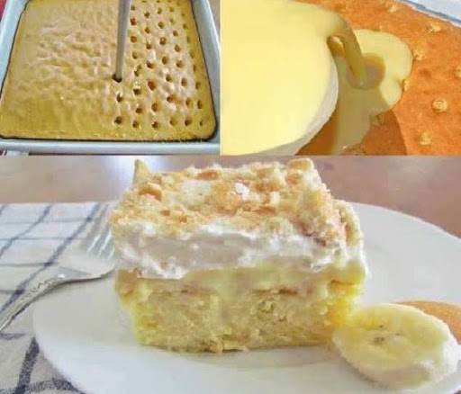 When just slightly cooled, use the end of a wooden spoon (the handle end) to poke holes into the baked cake. Don't be shy; make the holes big enough for the pudding to seep into and go deep enough with the spoon that you hit the bottom of the pan.