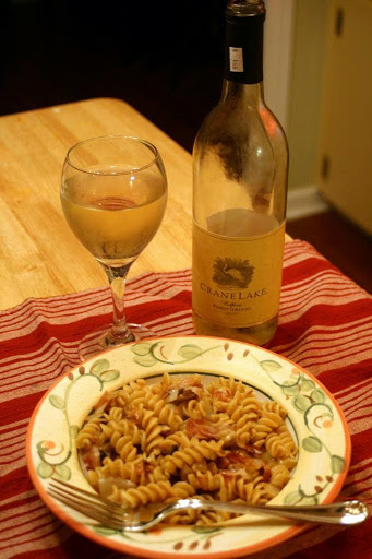 I love, adore, cannot get enough of pancetta. I see it on the Food Network all the time, but it's hard to find in my tiny town. So when I do, I buy it with the intention of doing something wonderful with it. Well, I found it a while ago, got busy, threw it in the freezer--and forgot about it. I unearthed it for tonight's pasta, as I'm on my own and can indulge in my love of onions. I originally wanted to do this with zucchini as well, but my zucchis were well past their date of expiration, so we went with a limited veggie list.