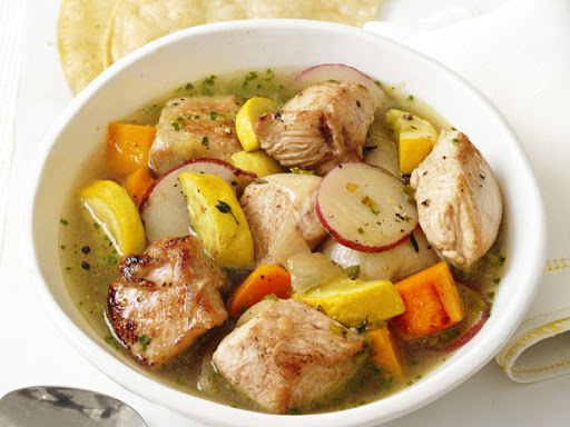 Stir in 5 cups hot water, the potatoes, butternut squash, zucchini, salsa and tostadas (the tostadas will dissolve and help thicken the broth). Cover and bring to a boil, then uncover and reduce to a simmer. Cook until the vegetables are tender and the turkey is just cooked through, about 15 minutes. Serve with more tostadas.