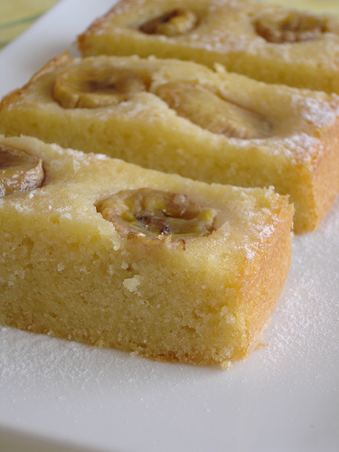 Peel and cut the bananas into 3-4 pieces each; “stick” them into the cake batter, keeping the pieces standing – there should be half an inch of banana out of the cake batter, or so.