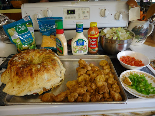 Generously spray the outside of a bundt pan with nonstick cooking spray. Place upside down on cookie sheet. Unroll bread dough and place over bundt pan. Lightly pinch sides of dough together and trip off excess dough at corners. Drizzle Italian salad dressing on the dough and sprinkle the dough with ½ package of Hidden Valley dry Ranch dressing. Bake for 15-18 minutes or until golden brown. Remove from oven and place on wire rack. Gently insert knife along sides to loosen. Cool on baking bowl for 15 minutes. Remove from pan and set upright – cool for 5 minutes. Then place chicken strips on cookie sheet and bake. Mix a lettuce salad with your favorite ingredients along with the cooked, chopped chicken in the bread bowl and serve.