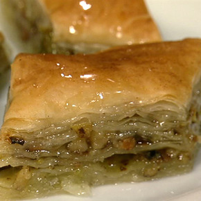 Butter bottom of a 9 X 13 pan with melted butter. Spread a phyllo leaf in the pan and butter this with a pastry brush. Put down another leaf and butter it. Do this with 10 phyllo leaves, buttering each leaf. Sprinkle 1/4 of the nut mixture on top of the 10th leaf.