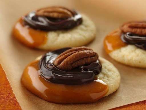 Spread about 1 teaspoon fudge topping on top of each cookie. Place pecan half on topping. Let stand about 15 minutes until toppings are set.