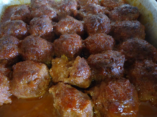 Combine meats, eggs, crumbs, and milk. Cover with sauce made from soup, vinegar, sugar, and mustard. Bake at 350 degrees for 1 hour. Can be frozen and baked anytime.