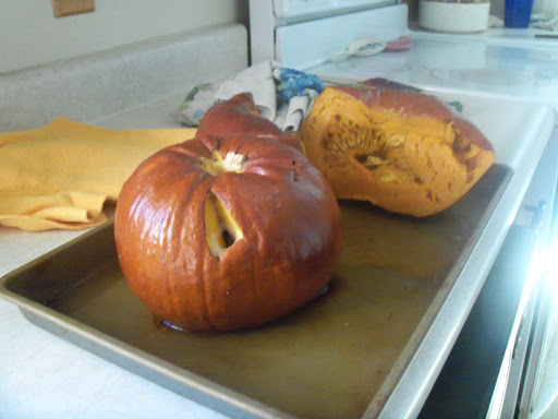 4. bake at 350 for 2 hours. untill a fork stabes through, tender like a potato. skin if the pumpkin will be tough.
