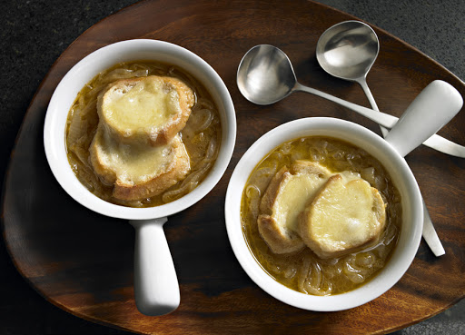 4. Ladle soup into individual serving bowls. Place one bread slice in each bowl ad sprinkle with Swiss cheese.
