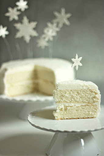 Remove the cake from the refrigerator. Place remaining frosting on top of the cake and spread it evenly over the top and sides. You can make the frosting textured to look like freshly fallen snow, as I did, or make it smooth.