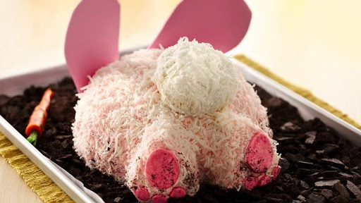 Spread remaining frosting over cake, using reserved 2 tablespoons white frosting to frost the bunny tail.