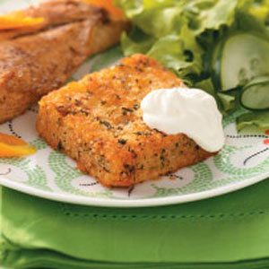 Crisp polenta squares make a delightful side for a variety of main dishes. Sun-dried tomatoes and just the right amount of seasoning make them seem special...a dollop of sour cream adds the finishing touch!