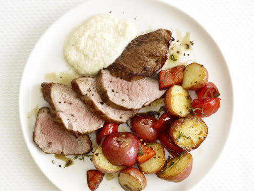 3. Pat pork dry and season with salt and pepper. Heat 1/2 tbsp EVOO in a large skillet over medium heat. Add the pork and sear until browned on all sides (about 6 minutes). Transfer pork to baking dish with the vegetables and continue to roast until registers 145 degrees (about 15-20 minutes). Transferthe pork to a cutting board adn let stand 5 minutes before slicing. Serve with roasted vegetables and creamy applesauce.
