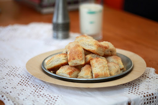 Place filled and sealed pastry squares on a foil lined and lightly greased baking sheet. Brush each square with cream and sprinkle generously with granulated sugar.