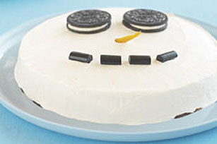 UNCOVER dessert. Invert onto serving plate; remove plastic wrap. Frost dessert with COOL WHIP. Add remaining cookies for the eyes, carrot for the nose and licorice pieces for the mouth.