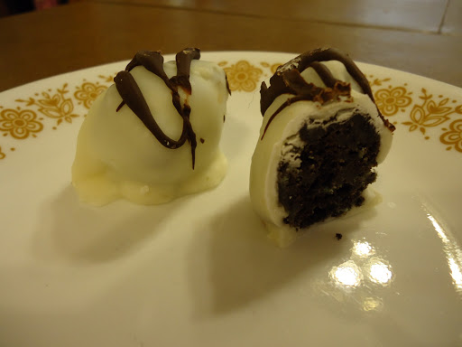 Crush the oreo cookies and mix the softened cream cheese. Form into balls and dip in melted white almond bark. Place on waxed paper. Melt a little bit of chocolate chips and put in a sandwich baggy. Clip one corner and drizzle it over the white balls.