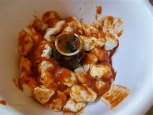 In a mixing bowl toss the dough sections with 3/4 cup of pizza sauce. Add Italian seasoning and stir.