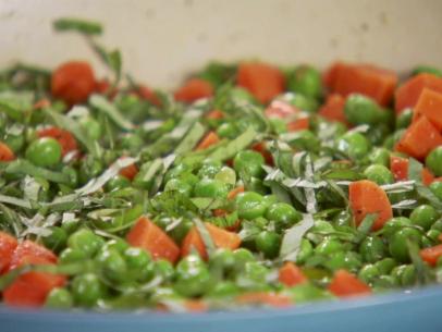 Melt the butter in a saute pan over medium heat. Add the carrots and saute until they are tender. Add the peas and salt and pepper to taste and saute until they are thawed and cooked through. Stir in the chopped basil before serving.