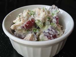 Combine diced celery, green onions, grapes, pasta and sliced chicken breast in large bowl.