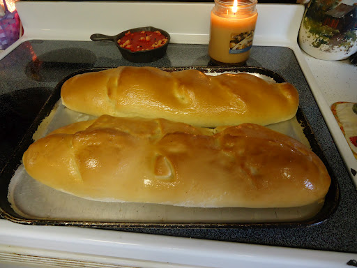 Cook onion, pepper, mushrooms and butter for a little bit. Roll out dough into a rectangle and in the middle, layer the meats, cheese, and warm veggie mixture. Cut slits along the sides of the dough. Alternately fold each strip over the top, overlapping into the center. Dab water with your hand on top to smooth the openings closed. Cover with a towel and let it rise until double. Bake it at 350 degrees for around 30 minutes or until golden and brush top with butter when done.
