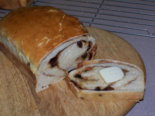 Turn the dough out onto the floured board and divide into three pieces, each one rolled out and spread with melted butter, cinnamon sugar and raisins. Roll up and let rise as normal (until doubled). Combine the egg and water and brush the tops of the loaves with a little of the glaze. Bake the loaves in a preheated 375°F oven for 35 to 45 minutes or until they test done. Turn out immediately onto a rack to cool.