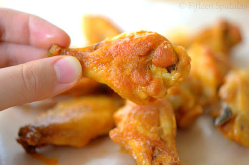 Place the chicken wings directly on a sheet pan. Bake the chicken wings for 25-30 minutes on one side, then flip the wings and bake for another 5 minutes on the other side. The wings should have crispy crackly golden skin on the side that was in contact with the sheet pan.