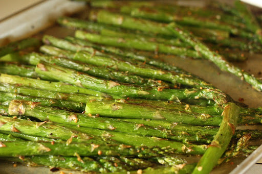 Place asparagus on parchment-lined baking pan, drizzle with oil and sprinkle with salt and pepper to taste.