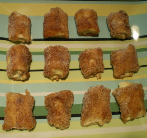 Dip each piece lightly in melted butter, then roll in mixture of sugar and cinnamon.