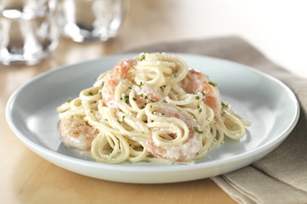 Cook pasta as directed on package, omitting salt. Meanwhile, heat dressing in large skillet on medium heat. Add shrimp; cook and stir 2 to 3 min. or until shrimp turn pink, adding garlic for the last minute. Remove shrimp with slotted spoon; set aside.