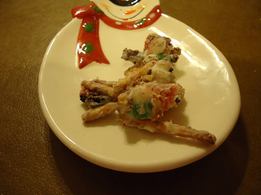 Cover cookie sheet with waxed paper. Put cookies and pretzels on cookie sheet. Melt almond bark and drizzle over cookie mixture. Add the reindeer corn while almond bark is still wet. Sprinkle with colored sugar and refrigerated until set. Break into chunks.