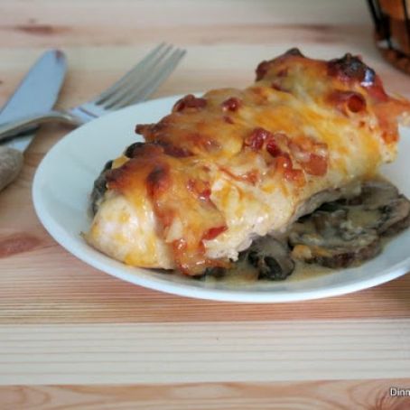 Sear chicken in pan for 3-4 minutes per side or until golden brown. Remove the pan from heat, but keep the chicken in the pan. As the chicken is cooking, saute the sliced mushrooms in butter in a small frying pan. Brush each seared chicken breast with a little of the reserved honey mustard marinade (not the portion the chicken marinated in), being sure to save a little extra to serve as a side. Season chicken with salt, pepper and a dash of paprika. Stack two pieces of bacon, crosswise, on each chicken breast. Spoon the sauteed mushrooms on the bacon, being sure to coat each breast evenly.