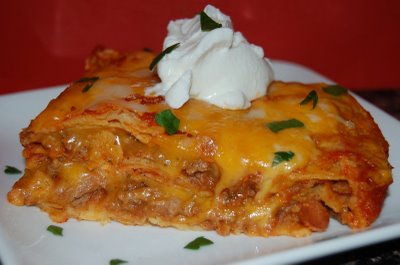 BROWN BEEF ADD ONIONS, SESAONING, OLIVES AND ENCHALADA SAUCE. IN BUTERED CASSEROLE, ALTERNATE LAYERS OF TORTILLAS, MEAT MIXYURE, CHEESE, ENDING WITH CHEESE. ADD WATER AND COVER AND BAKE AT 400 DEGREED FOR ABT 20 MIN.OR PUT IN FOIL BAN AND COOK ON BBQ!!!