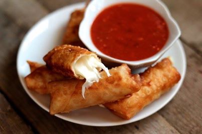 Place each cheese stick half onto the center of a wonton wrapper. Wet the tip of your fingers with a little bit of water and moisten the edges of the wonton wrapper so that it will seal nicely. Fold the bottom of the wrapper up over the cheese, followed by both sides, then finally the top to seal. Carefully place the wontons seal side down into the hot oil. Cook until golden brown and crisp, about 1-2 minutes, then flip and cook another 1-2 minutes. Carefully transfer them to a paper towel-lined plate to drain. Serve promptly with warm marinara sauce on the side.