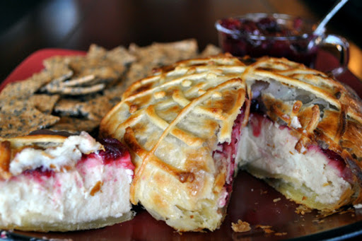 Top with Macadamia Nut Brie (smooth side touching the cranberry sauce). Leaving a few inches all around, cut puff pastry into a round following the brie as a guide. Tuck edges up in a pinwheel fashion.