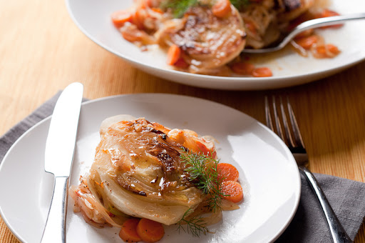 Add the orange zest and juice, the vermouth, and 1/2 cup water and stir, scraping the bottom to incorporate the delicious caramelized brown bits (fond). Put the fennel back in the pot, cut side up, on top of the onions and carrots. Cover the pot and braise until the fennel is completely tender when probed with a knife. This could be anywhere from 10 to 20 minutes depending on the size of the bulbs. During the braise, adjust the heat so that there is a good steady amount of steam in the pot, but not so much that all the liquid is boiling off. Add a bit more liquid if needed.