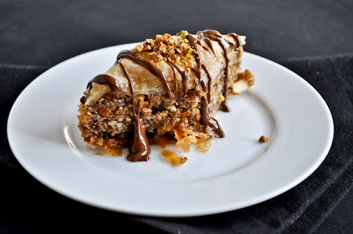 Melt butter on the stovetop or in the microwave. Using a pastry brush, brush an entire 9x 13 pan with melted butter. Layer 8 sheets of phyllo dough – each one painted with melted butter – in the baking dish. Be very patient and gentle with the dough, and if it begins to rip, just try to push it into place. After layer 8, spread 1/4 of the nut mixture evenly over the dough. At this point, I wasn’t sure how the next sheet of phyllo would stick to the nuts, so I took my pastry brush and drizzled a bit of butter over the nuts. This helps!
