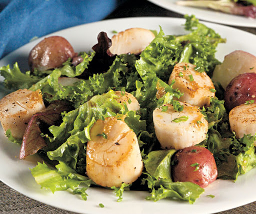 In this streamlined dinner salad, the scallops are seared on very high heat so the outside browns and the inside remains juicy. For best results, look for "dry" scallops, not ones marked "water added," and remove the tough tabs of muscle with your fingers. A couple of minced anchovies and a tablespoon of rinsed capers would give the salad a briny touch.