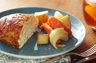 MIX turkey, minced onions, cracker crumbs and egg white in same bowl. Remove vegetables from oven; stir, then push to edges of pan. Shape turkey mixture into 6x3-inch oval loaf; place in center of pan. Brush with barbecue sauce.